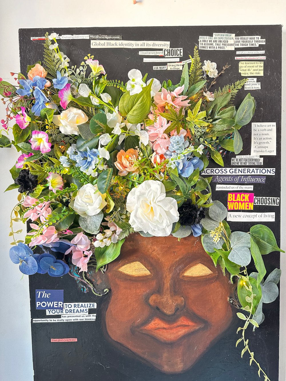 “Jambi Says” March 2024; 24”x 36” MIXED MEDIA: faux flowers, acrylics, & magazine strips on canvas; $3333
